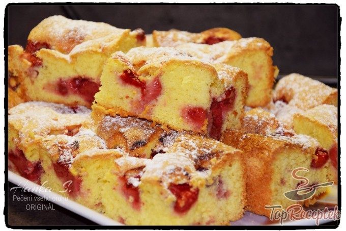 A tojássárgáját a kristálycukorral és vaníliacukorral fehéredésig keverjük. Hozzáadjuk az olajat és a vizet, alaposan elkeverjük, majd beleszitáljuk a finomlisztet és a végén a kemény tojáshabot laza mozdulatokkal, hogy ne törjük nagyon, beleforgatjuk. Kivajazott tepsibe öntjük a tésztát, gyümölccsel megszórjuk. 170 fokon aranyszínűre sütjük. A kész, kihűlt sütemény tetejét porcukorral meghintjük.